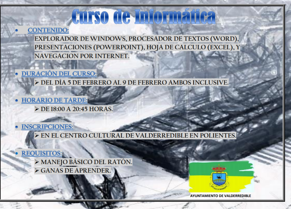 Curso de informática, ofrecido por el ayuntamiento, que se impartirá del día 5 al 9 de febrero por las tardes de 18:00 a 20:45h. Interesados inscribirse en el centro cultural.